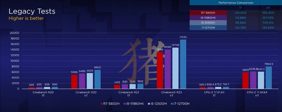 O Intel Core i5-12500H e Core i7-12700H, ambos testados por um usuário do Weibo, revelaram ser capazes de superar o Core i9-11980HK, o processador mobile mais avançado da geração antecessora, além de mostrarem desempenho superior ao AMD Ryzen 7 5800H com Zen 3. No Cinebench R23, o i7-12700H é 33% mais poderoso que a solução rival.
