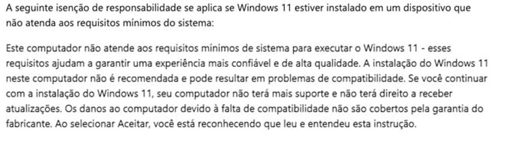 Agora, a companhia parece ter abaixado um pouco a guarda quanto a esses requisitos, já que atualizou a página de suporte englobando a instalação do win11 em dispositivos com hardware incompatível – embora o texto seja recheado de ressalvas.